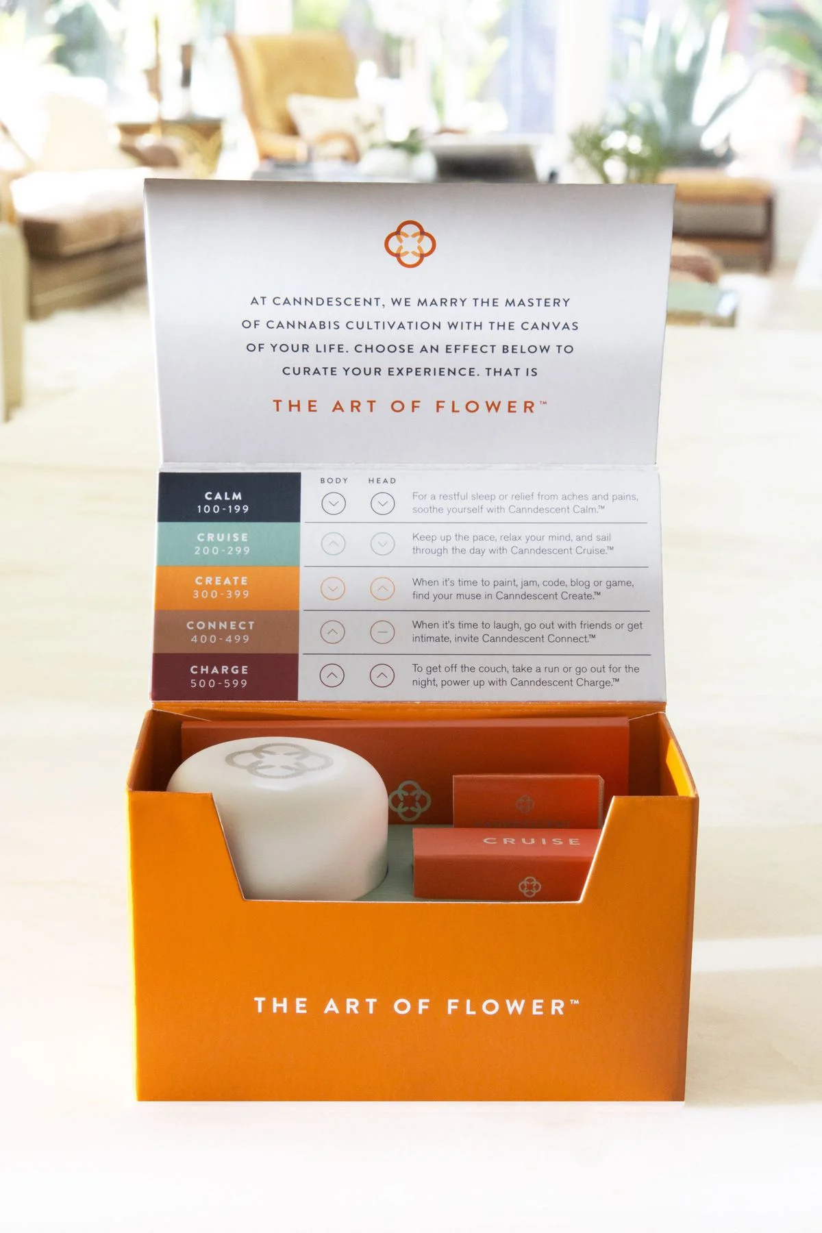 The naming architecture for Canndescent’s 5 flower offerings makes the selection process much easier for new and experienced consumers alike. Rather than coin names like “Blue Dream,” “Lemon Haze,” or “Gorilla Glue,” Canndescent defines their flowers by desired mental state — Calm, Cruise, Create, Connect, and Charge. They call this “The Art of Flower.” Taking inspiration from the likes of BMW, Canndescent also implements a number-based ranking system to allow for the continued progression of its product line. Anything in the 100s represents a Calm strain, anything in the 200s will be a Cruise strain, so on and so forth. The higher the number, the more energetic of a high you’ll experience. The remodeling of the selection process leaves consumers with just one, simple question: “How do I want to feel?”